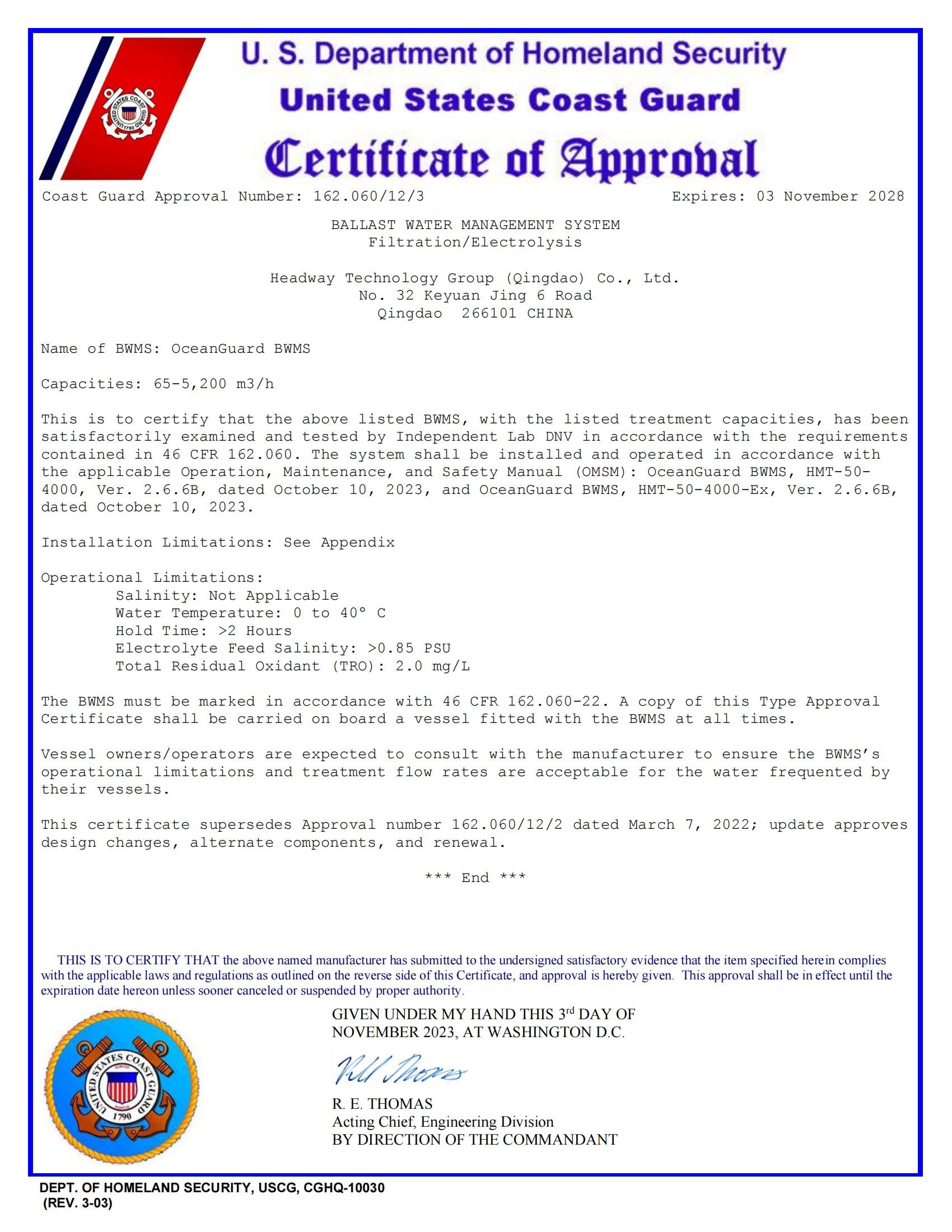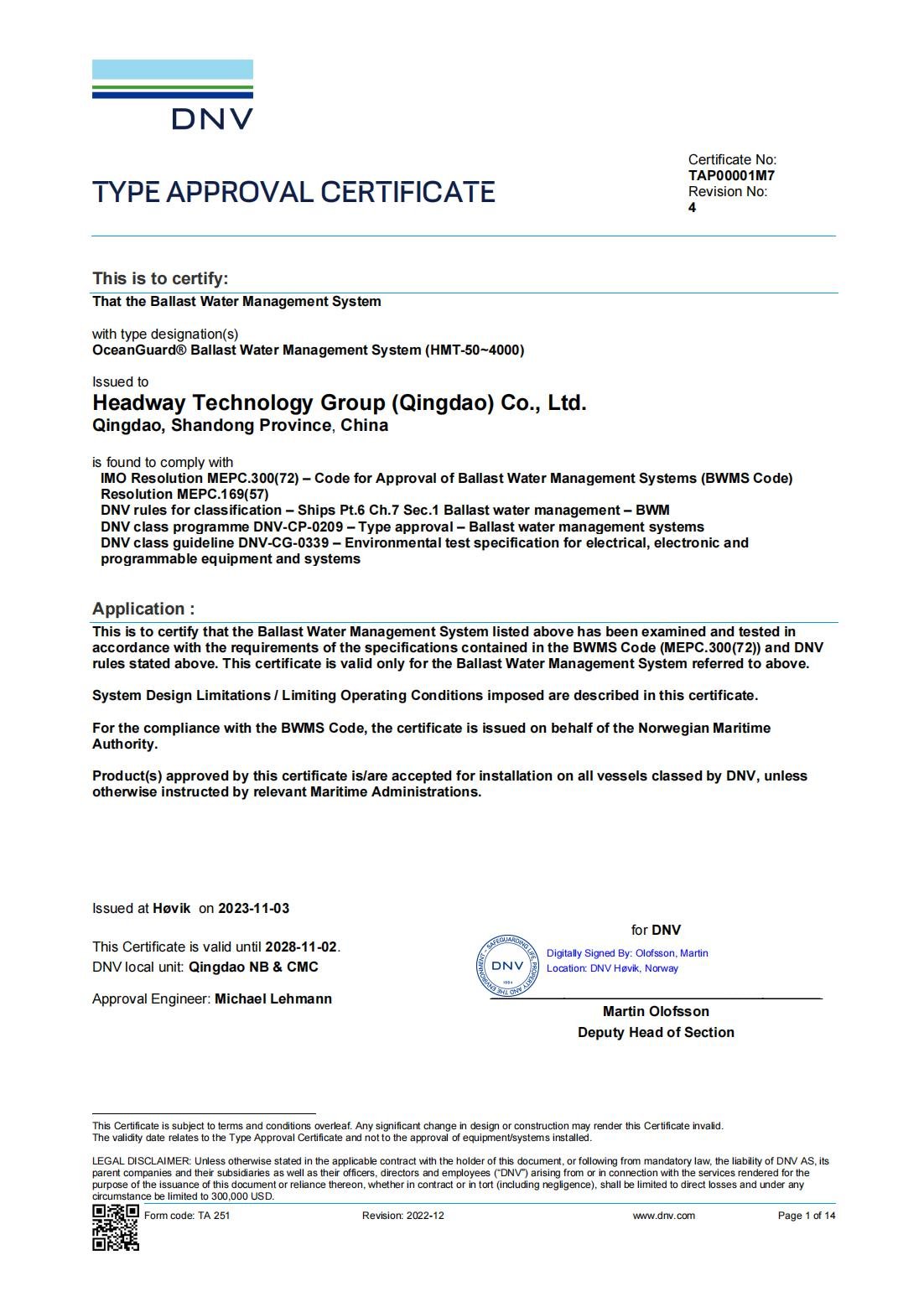 海洋卫士®压载水管理系统(BWMS)采用“电催化高级氧化技术”,具有单次处理、体积小、无氢气、超低能耗,以及不受水域盐度、温度、浊度影响等优势。系统拥有涵盖近20个主流船级社和船旗国在内的全面认证,订单量与市场份额稳居世界前列。